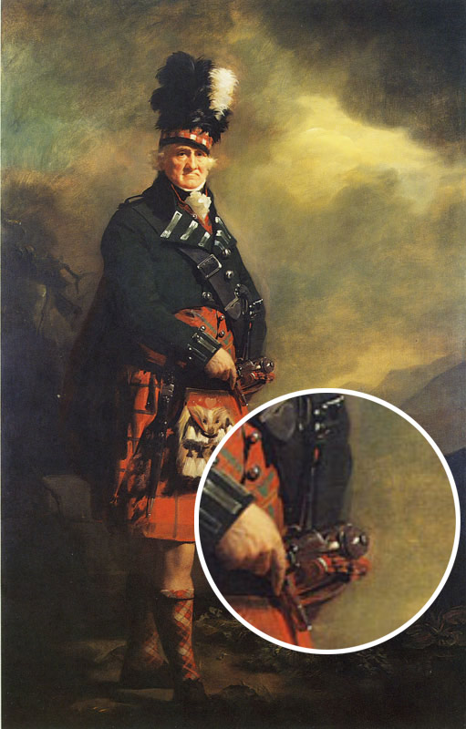 Interestingly, a close look at the portrait shows that Francis is not carrying a pair of pistols, as one would expect, but two quite different ones. The one on his shoulder belt is a classic Scottish ramshorn butt pistol , but in his right hand he is carrying a small screw barrelled pocket pistol. Both of these weapons would have been made decades before the picture was painted about 1813. In the National Gallery of Scotland commentary on the portrait, they note ” at the right cuff of the coat MacNab’s fist emerges holding a tiny pistol “.