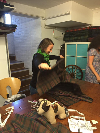 A few google searches pulled up ‘The Edinburgh Kiltmakers Academy’, this quickly turned into a visit. Both myself and Agnieszka (our very talented seamstress/crafts person) popped in to see what they were up to. In a basement below Gordon Nicholsons Kilt Makers we met Nikki Laird, basically ‘The Kilt Guru’. Together with Gordon Nicholson she had created The Edinburgh Kiltmakers Academy. It took about 10 seconds and we were both totally sold on the idea of joining the course. Thanks to CAPITB trust we were able to get funding to put both myself and Agnieszka through the kilt making course.